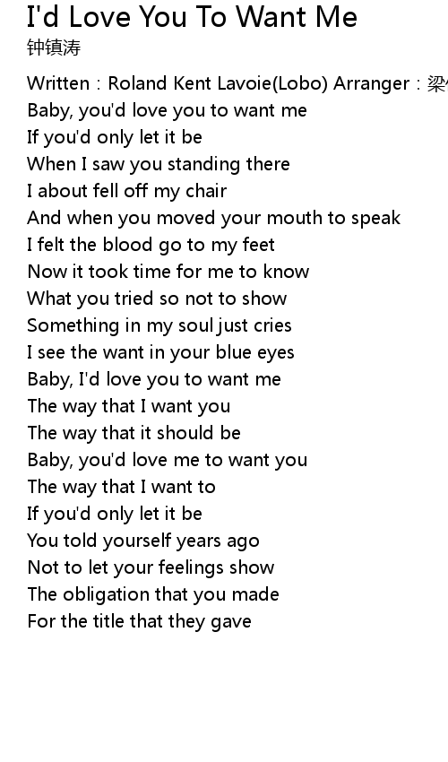 I'd love you to want me (lobo) 109. Lyrics to 300 seventies songs seventies lyrics hit parade : Baby, i'd love you to want me the way that i want you the way that it should be baby, you'd love me. I'm gonna love you just a little more baby (barry white) 114... I couldn't find anything to rhyme that fit what i wanted to say in the song.
